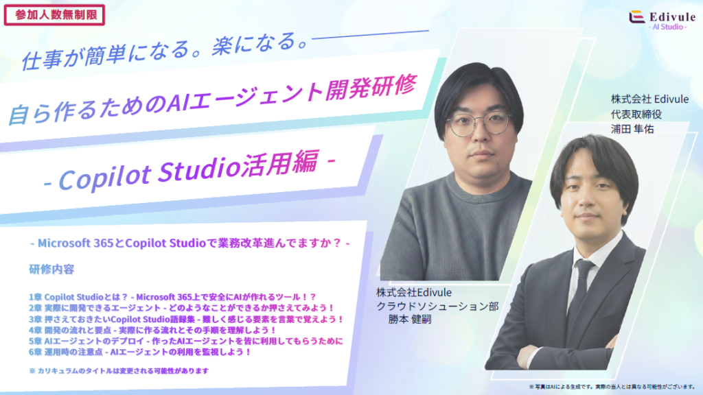 株式会社Edivule(本社:東京都杉並区、代表取締役:浦田 隼佑)は、Microsoft 365をご利用中、または導入を検討中の企業様を対象に、Copilot Studioによる業務効率化 生成AI構築の実践セミナーを開催いたします。